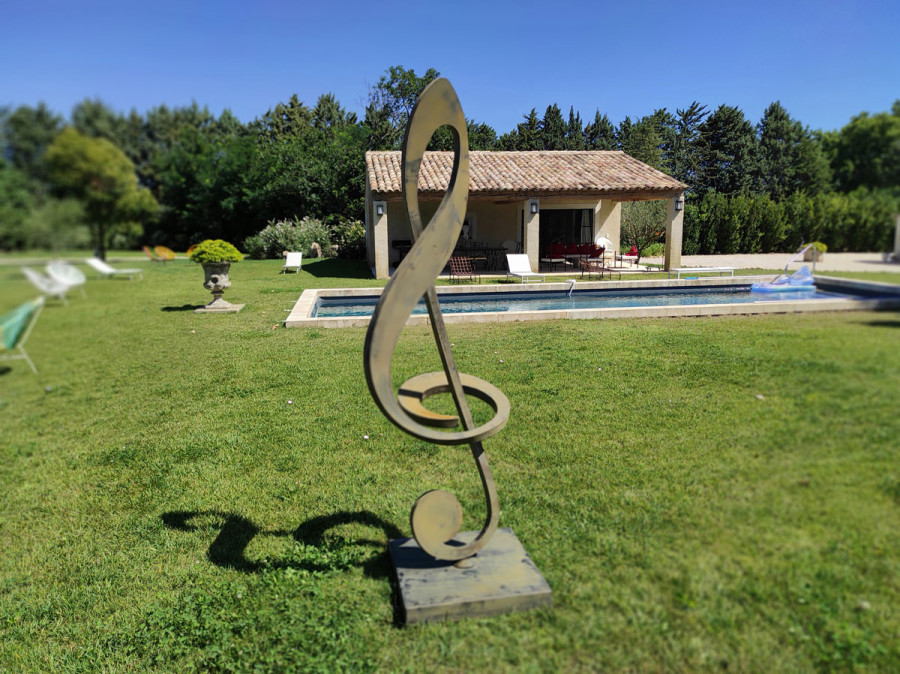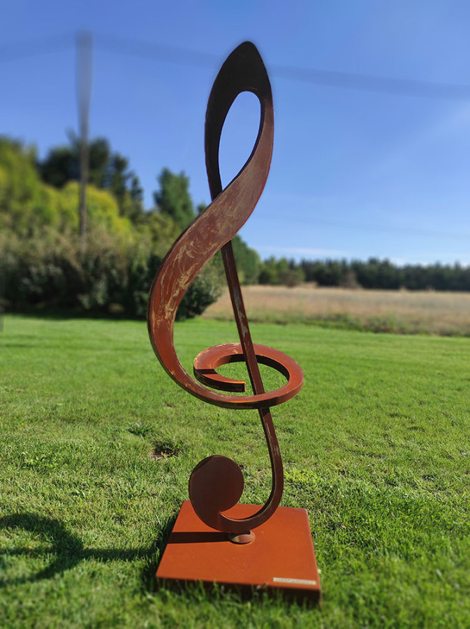La clé de sol, symbole universel de la musique, est ici magnifiée par une conception d'une élégance rare. Sculptée dans des matériaux de la plus haute qualité – acier inoxydable, acier Corten ou aluminium – chaque courbe et chaque détail sont travaillés avec une précision inégalée. L'œuvre, de plusieurs mètres de haut, impose sa présence tout en conservant une légèreté visuelle grâce à ses lignes fluides et gracieuses.